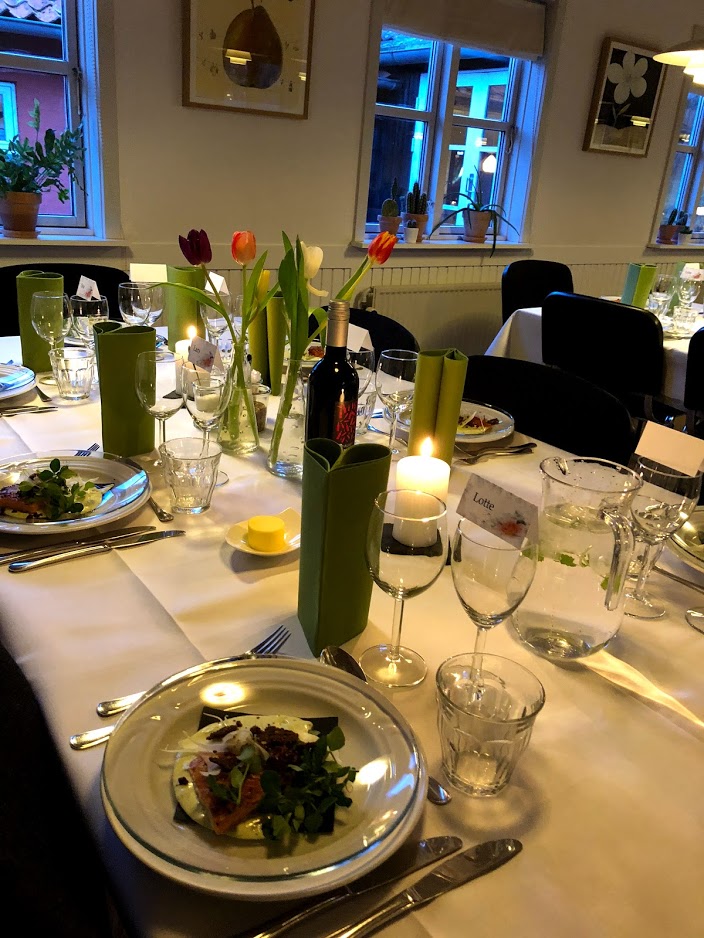 Brudgommens far eller mor sidst under hovedretten + en sang. Evt. bruden og vennerne og familie imellem hovedret og dessert + en sang eller to.